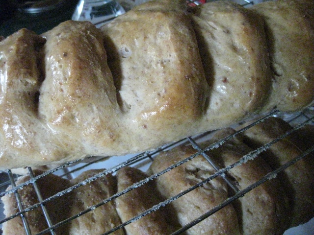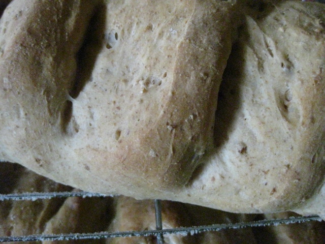 6. When the bread is well browned and done, remove from the oven, slip on to a baking rack, and brush with butter or olive oil while still very hot. (The first picture below is a close up of the bread before this brushing on of the fat, while the second shows the sheen that results from the oil or butter wash.) When the bread is just cool, store in a plastic bag.