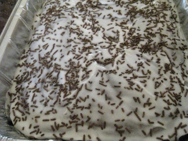 While suggested toppings for the cake include peanut butter and chocolate frostings, I found that a basic powdered sugar icing is second best–second only to serving the cake warm with some vanilla or butter pecan ice cream scooped on top. The version here also has chocolate sprinkles added for one more source of chocolate for those who can’t get enough!