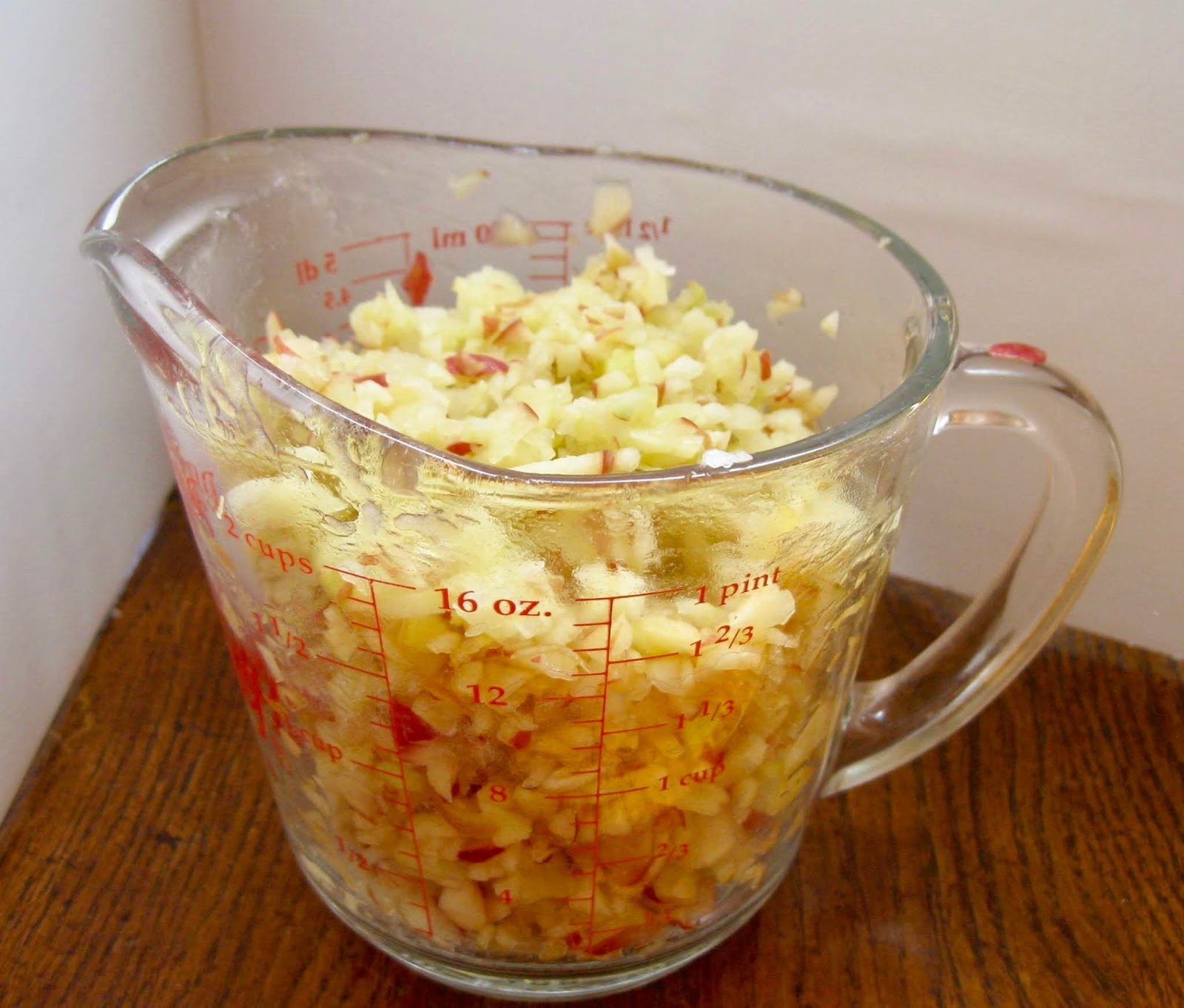 This goes together quite quickly, except for chopping or grating the apples. As I noted with the Apple Gingerbread I just posted, this is the time to use a small food processor or chopper like the one that came with my immersion blender. But if you don’t have any electric appliance like that, it still doesn’t take too much time to grate or finely chop the apples, and the results are well worth it.