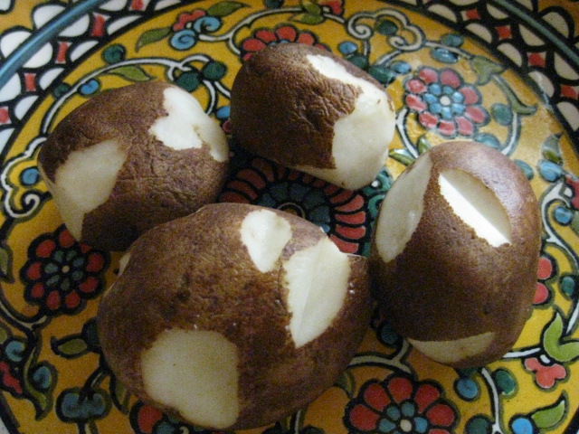4. Meanwhile, cut the potatoes into thick slices (about 1/2 inch thick). Spread the potato slices across the pan and stir them in so that they are all coated with the browning marinade. If necessary, add a tablespoon or so of water to be sure all the meat and potatoes are being steeped in the pan juices–just don’t add too much. You want to keep the mixture sauteeing, not poaching!