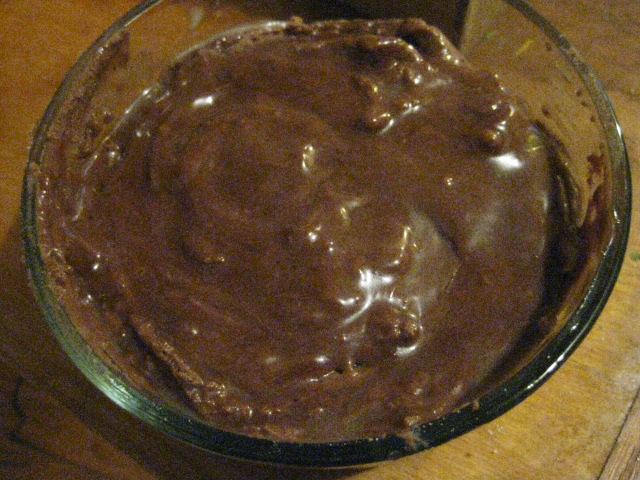 A few proportions were changed, along with the overall method, trying to simplify as much as possible. In the end, it came out pretty much as I remembered that earlier cake–moist and chocolate-y yet not too rich. And, if you have apples readily available from your own trees or a local orchard, pretty frugal as well.