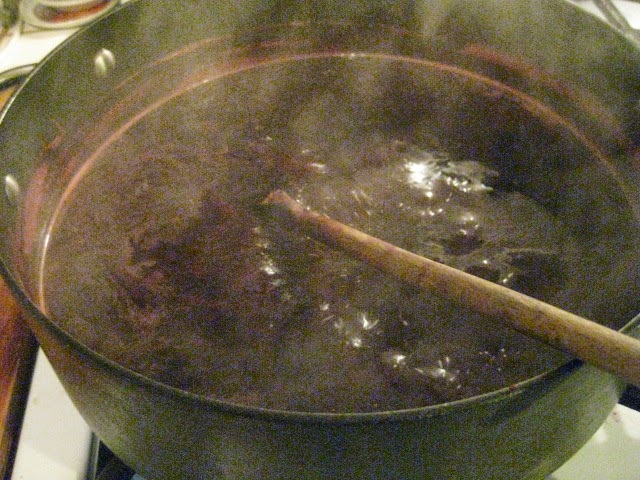 3. Compost the thick parts left in the food mill or colander and then return the strained grapes to the pot. Stir in the sugar and lemon juice and heat the mixture to a boil over medium high heat. Reduce heat a bit if the grape syrup begins to splatter.