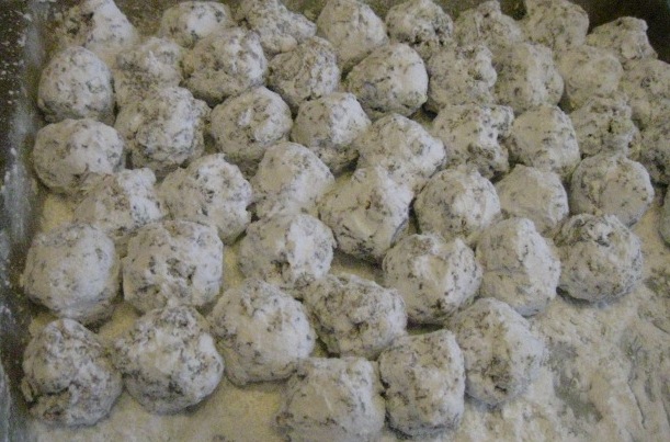 Personal experience: One year I made these late in the evening and tucked them into the refrigerator. In the morning, I realized I had a mass that wasn’t going to roll into balls. I ended up allowing the mixture to warm just enough to be slightly malleable. Then I pressed it firmly into a well-buttered pan (if I remember, it fit in a 9 X 12 pan) and then cut into squares. Because I was already behind time, I only sprinkled the top with powdered sugar, but the squares could have been rolled in powdered sugar just as with balls. In fact, that might be a quicker (if not so traditional) way to get these finished–and it could provide a different shape for the cookie tray already full of powdered sugar covered balls of other kinds of cookies.