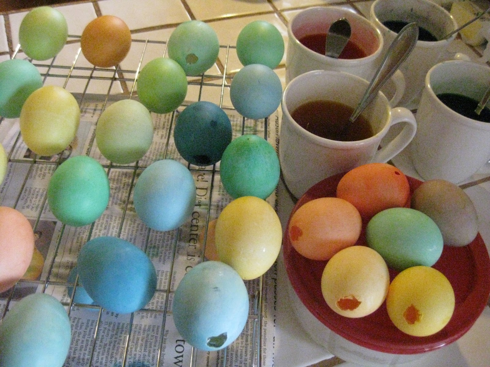 Since I didn’t start early enough with the egg blowing, there are another dozen and a half “real”–boiled–eggs for coloring as well. Still some more decorating of the hollow eggs before we slip strings into them to tie on a bush in the front for our own Easter egg tree.