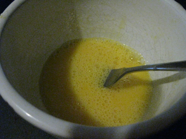 2. While the vegetables are cooking, beat the eggs together with the milk. Stir in any herbs or garlic you will be using. Beat until the eggs are a uniform yellow color.