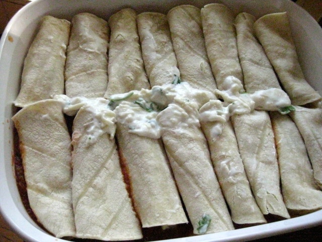 - Spread a small amount of the enchilada sauce in the bottom of a 9 X 13 casserole or pan.