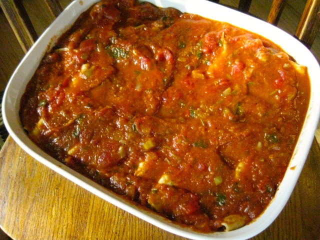 For a “redder” version of the enchiladas, omit the cheese topping, finishing the assembly by just spreading the enchilada sauce over the top.