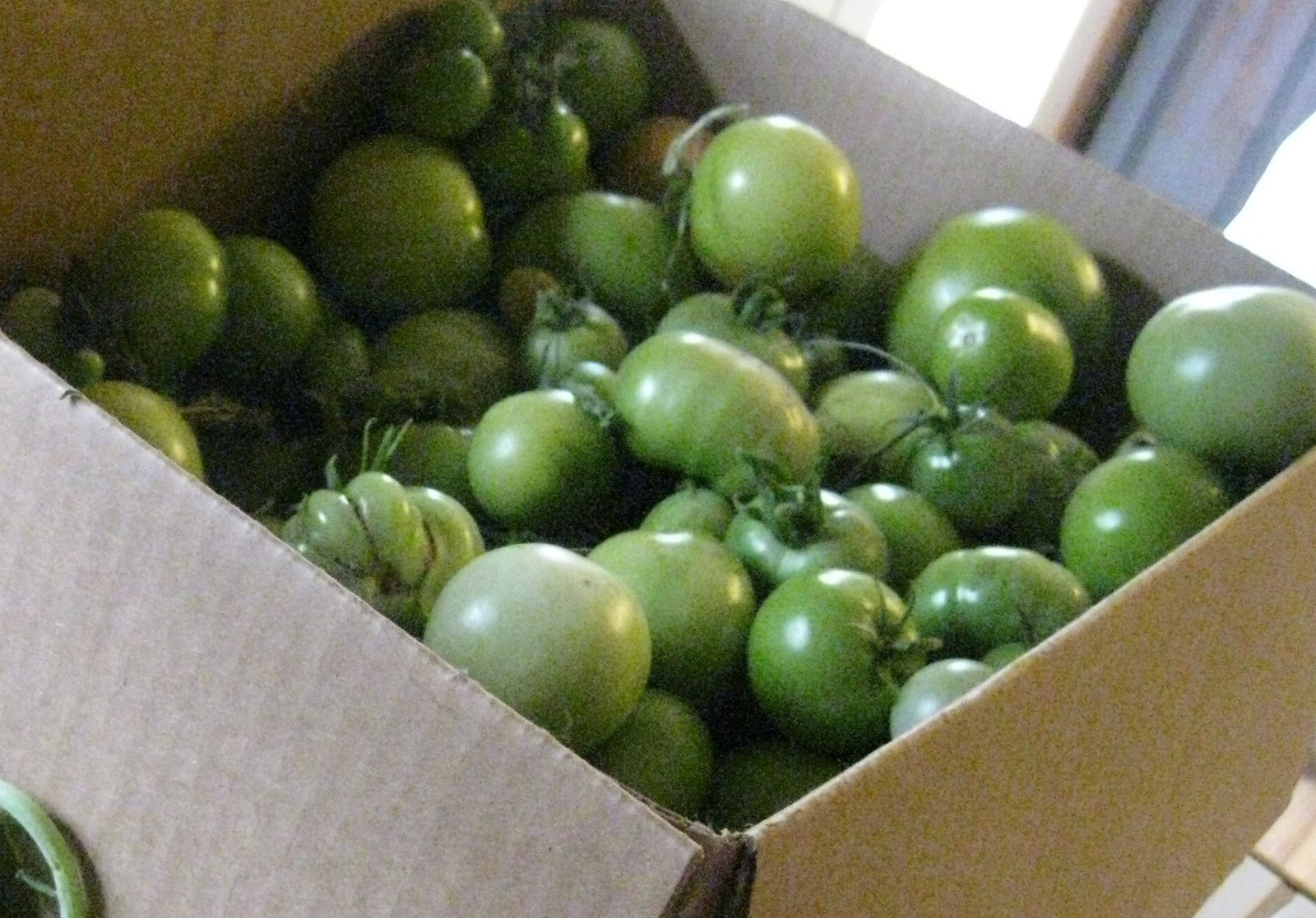 NOTE: “Green” tomatoes can be a loosely descriptive term, since some of the tomatoes you will try to save from frost will be almost ready to turn red (or yellow, depending on variety), while others will be bright green and as hard as little green apples. The greener ones will be much more tart and often are more strongly flavored. Some will look green on the outside but will really be very close to ripening–as the picture below illustrates.