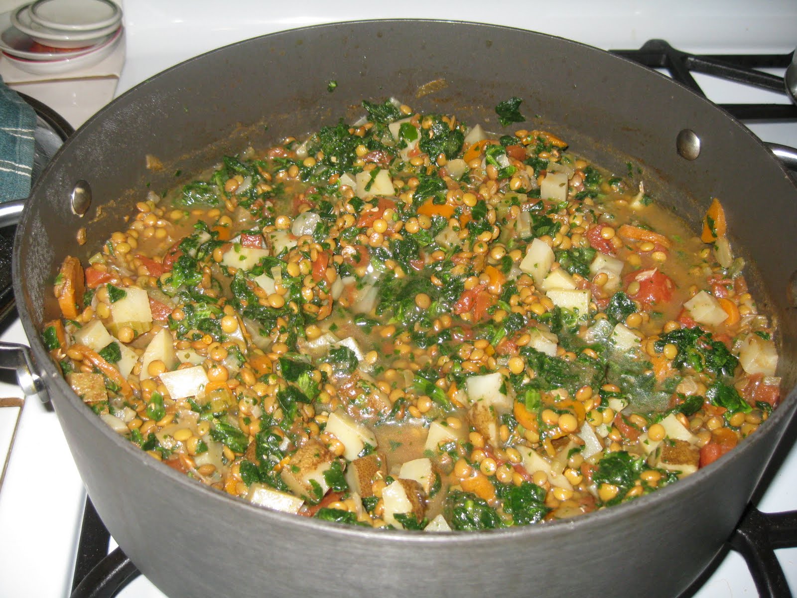1. Saute the onions and carrots (and celery if used) in the oil until the onions are golden. Combine with the lentils, garlic, water, and bouillon cubes.