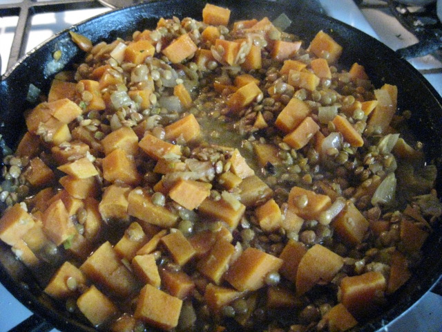 Probably the best way to start using these magic beans (okay, so they aren’t beans, but they are related) is in some east Asian, especially Indian, recipes. The one I’m introducing today is an incredible powerhouse nutritionally–sweet potatoes, kale, olive oil, lots of fragrant and wonderful spices and, of course, lentils. On top of all this, the dish can be prepared in just under an hour, and it is easily scaled up so you can have leftovers for lunches or a second dinner later in the week.