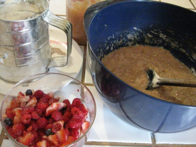 Today, for example. My blueberries are still in their first real season of bearing, so I only had a handful of ripe berries available, and I had about the same amount of raspberries this morning, as the first of the two everbearing seasons taper off. With some strawberries from the store I wanted to use up, this seemed like the perfect time to make muffins using all three.