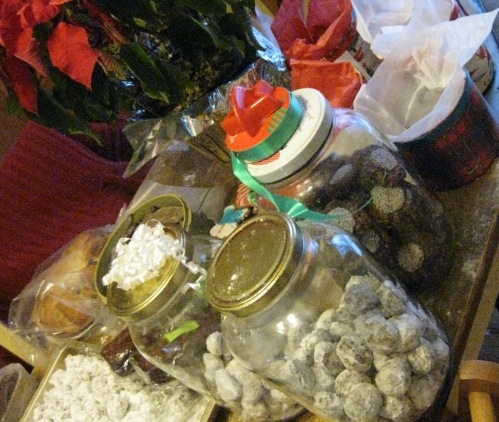 7. Place a cup or so of powdered sugar in a small plastic bag. Put three to four of the cookies into the bag and shake to coat them well. Shake off loose powdered sugar and return the coated cookies to racks. If desired, you can coat the cookies while still warm and then a second time after they have cooled. Makes about 5 to 6 dozen cookies.