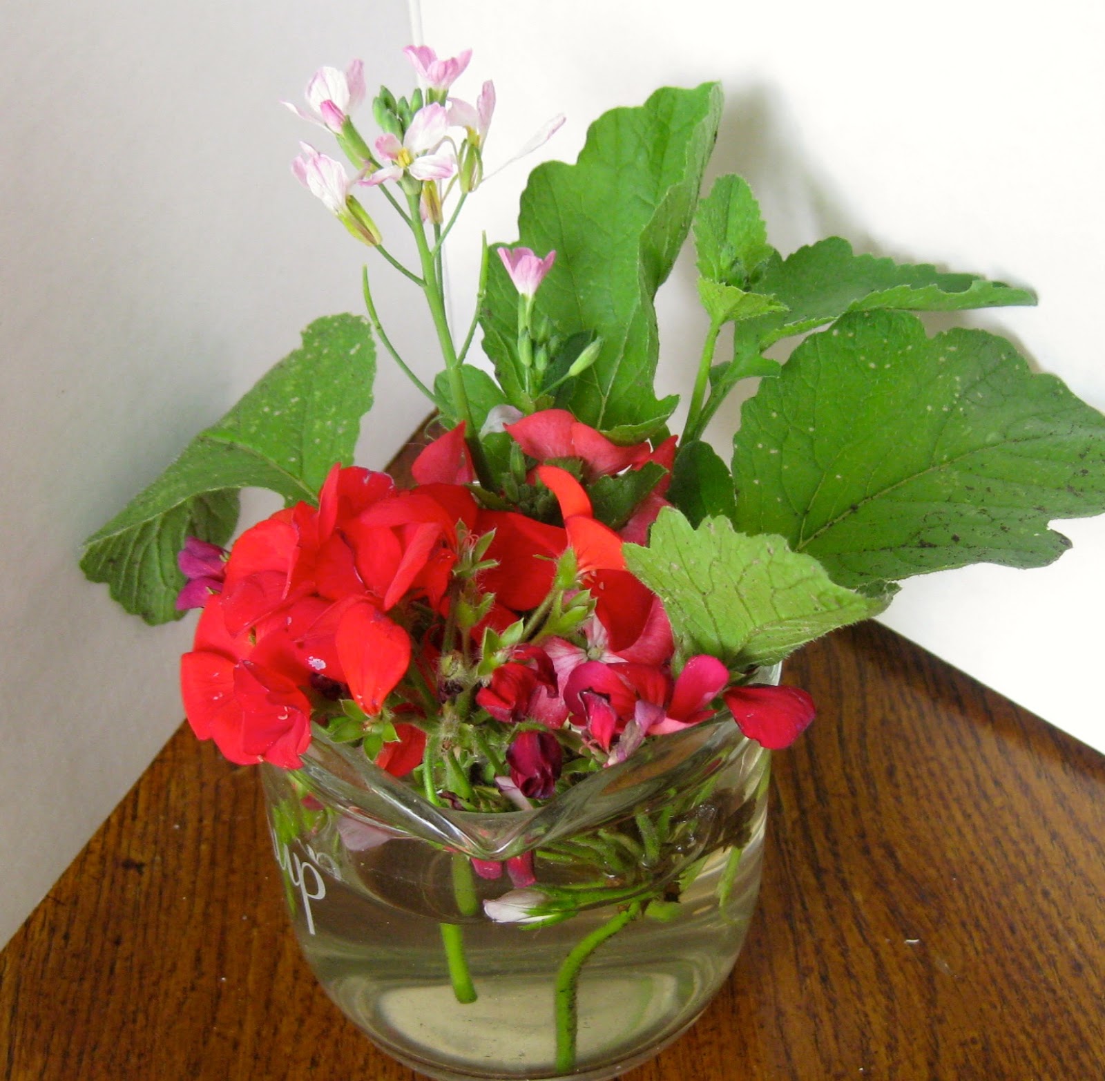 Finally. If you manage to miss a stray radish in the garden, one more surprise: that delicate little blossom with the geraniums in the photos above and below is actually a radish blossom, one that is lasting for days as a tiny cut flower. It’s nice to discover that these quick to grow plants (often ready for harvest barely a month after planting) can add so much versatility to a garden’s harvest.