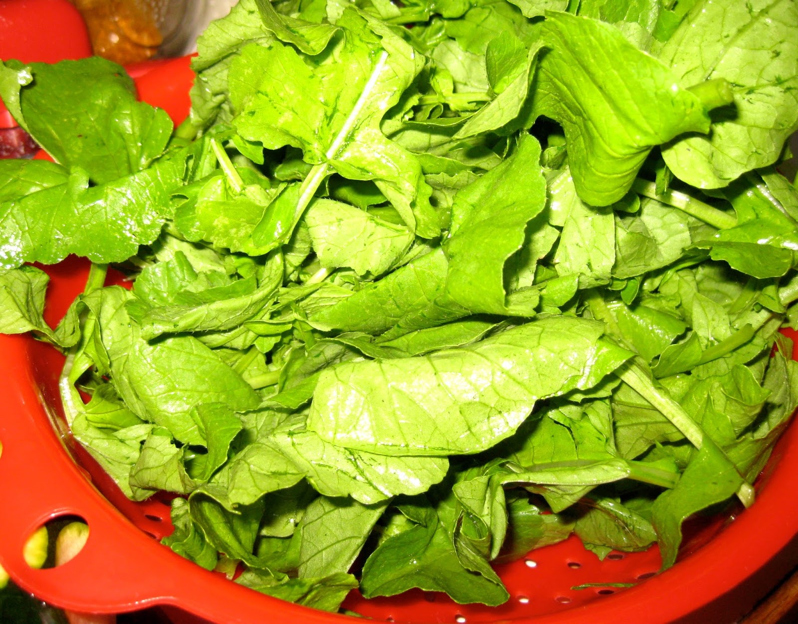 - radish greens–probably about 4 to 5 cups of greens for 2 to 3 total cups of chopped vegetables–at this stage, I discarded all but the smallest of stems and used only the leaves