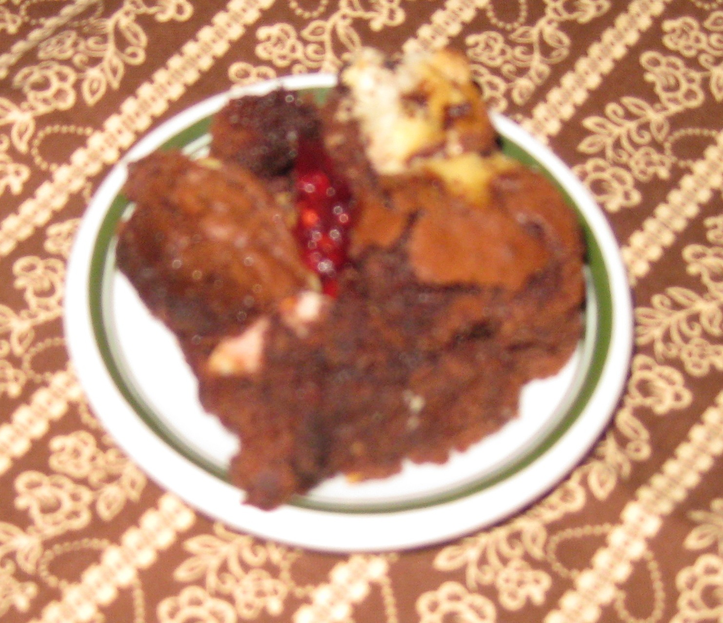 My latest batch went so fast, there was only one left to get into a photo. As you can see, these are chewy, moist, the best kind of fudgy brownie with the added panache of raspberry. Enjoy!