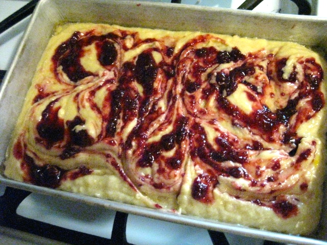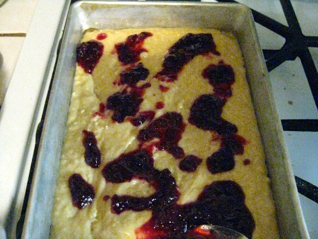 3. Drop the jam evenly across the batter and then use a knife to swirl it in lightly. Do not overmix.