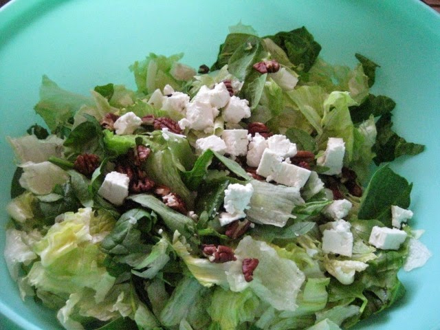This salad is successful because it pairs some strong flavors–feta cheese and a good vinagrette dressing–with sweet apples and mild (yes, that really is an adjective for them) beets. The deep green of the lettuce and/or spinach provides a great mix of colors, and the addition of nuts which can be optional) increases the textural variety.